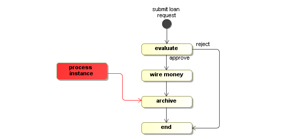 这个例子有一个特点:wire money(汇钱)和archive(存档)是并发执行的。 这个时候,总线路代表ProcessInstance,而分线路中每个活动代表Execution。
