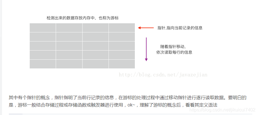 在前面的分析中可知sql的检索操作返回的数据几乎都是以整个集合的形式,也就是说sql善于将多条查询记录集中到一起并返回,倘若现在需要一行行地处理查询的结果,这对于sql语句来说确实是个难题,好在存在一种称为游标的技术可以解决这个问题,所谓的游标就就是可以将检索出来的数据集合保存在内存中然后依次取出每条数据进行处理,这样就解决了sql语句无法进行行记录处理的难题,游标的读取图解如下:
