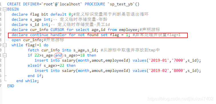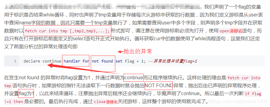 declare continue handler for not found set flag = 1; #异常处理并设置flag=1