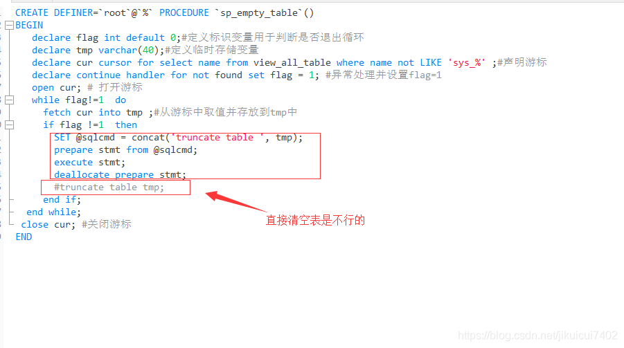 例如上述,我写的是利用游标,清空对应的表,但会出现表“不存在”的情况。