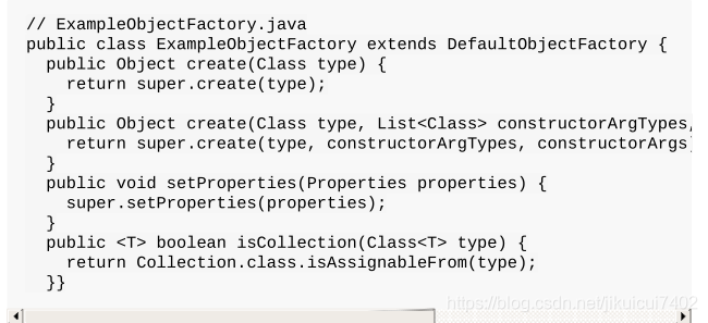 MyBatis 每次创建结果对象的新实例时,它都会使用一个对象工厂(ObjectFactory)实例来完成。 默认的对象工厂需要做的仅仅是实例化目标类,要么通过默认构造方法,要么在参数映射存在的时候通过参数构造方法来实例化。如果想覆盖对象工厂的默认行为,则可以通过创建自己的对象工厂来实现。比如: