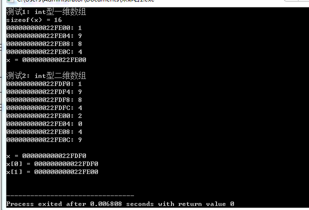#include<stdio.h> #define N 4 #define M 2 void test1() { int x[N]={1,9,8,4} ; int i; printf("sizeof(x) = %d\n", sizeof(x)); for (i = 0; i < N; ++i) { printf("%p: %d\n", &x[i], x[i]); } printf("x = %p\n", x); } void test2() { int x[M][N] = {{1, 9, 8, 4}, {2, 0, 4, 9}}; int i, j; for (i = 0; i < M; ++i) for (j = 0; j < N; ++j) printf("%p: %d\n", &x[i][j], x[i][j]); printf("\n"); printf("x = %p\n", x); printf("x[0] = %p\n", x[0]); printf("x[1] = %p\n", x[1]); printf("\n"); } int main() { printf("测试1: int型一维数组\n"); test1(); printf("\n测试2: int型二维数组\n"); test2(); }