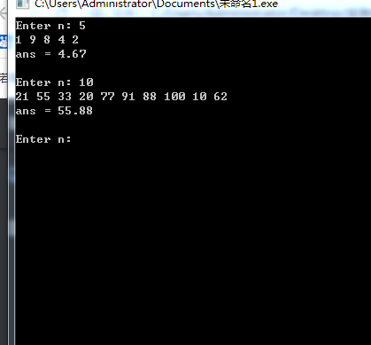 #include <stdio.h> #define N 100 // 函数声明 void input(int x[], int n) { int i; for(i = 0; i < n; ++i) scanf("%d", &x[i]); } double compute(int x[], int n) { int i, high, low; double ans; high = low = x[0]; ans = 0; for(i = 0; i < n; ++i) { ans += x[i]; if(x[i] > high) high = x[i]; else if(x[i] < low) low = x[i]; } ans = (ans - high - low)/(n-2); return ans; } int main() { int x[N]; int n, i; double ans; while(printf("Enter n: "), scanf("%d", &n) != EOF) { input(x, n); ans = compute(x, n); printf("ans = %.2f\n\n", ans); } return 0; }
