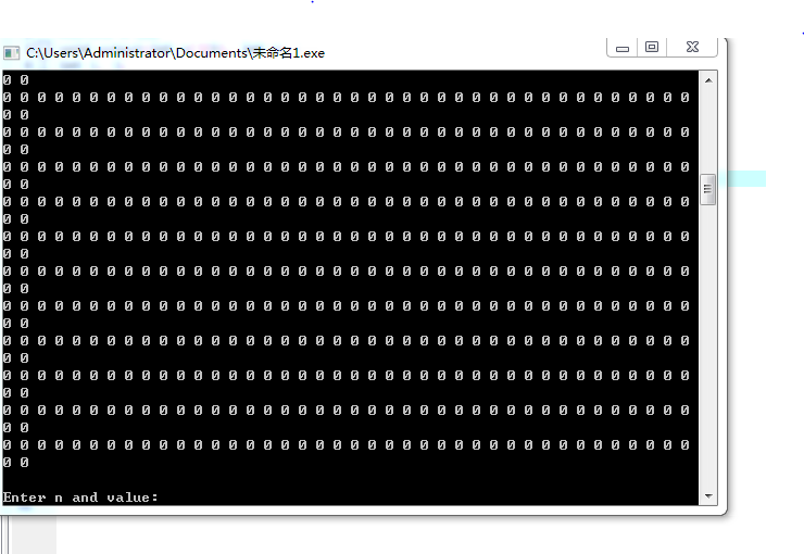 #include <stdio.h> #define N 100 void output(int x[][N], int n) { int i, j; for(i = 0; i < n; ++i) { for(j = 0; j < n; ++j) printf("%d ", x[i][j]); printf("\n"); } } void init(int x[][N], int n, int value) { int i, j; for(i = 0; i < n; ++i) for(j = 0; j < n; ++j) x[i][j] = value; } int main() { int x[N][N]; int n, value; while(printf("Enter n and value: "), scanf("%d%d", &n, &value) != EOF) { init(x, n, value); output(x, n); printf("\n"); } return 0; }