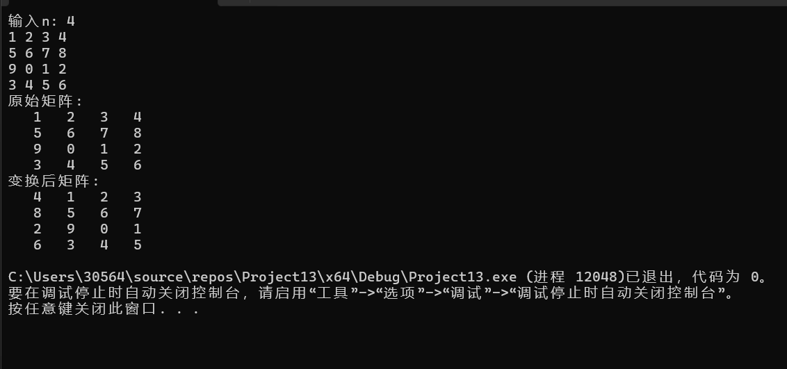 #define _CRT_SECURE_NO_WARNINGS #include <stdio.h> #define N 100 void input(int x[][N], int n) { int i, j; for (i = 0; i < n; ++i) { for (j = 0; j < n; ++j) scanf("%d", &x[i][j]); } } void output(int x[][N], int n) { int i, j; for (i = 0; i < n; ++i) { for (j = 0; j < n; ++j) printf("%4d", x[i][j]); printf("\n"); } } void rotate_to_right(int x[][N], int n) { int c; int r; int a[N]; for (r = 0; r < n; r++) { a[r] = x[r][n - 1]; } for (c = n - 2; c >= 0; c--) { for (r = 0; r < n; r++) { x[r][c + 1] = x[r][c]; } } for (r = 0; r < n; r++) { x[r][0] = a[r]; } } int main() { int x[N][N]; int n; printf("输入n: "); scanf("%d", &n); input(x, n); printf("原始矩阵:\n"); output(x, n); rotate_to_right(x, n); printf("变换后矩阵:\n"); output(x, n); return 0; }