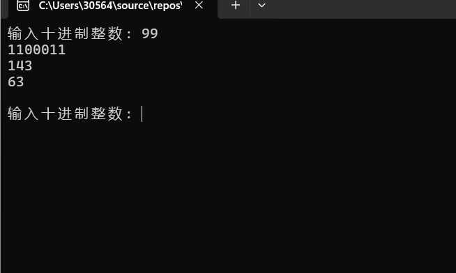 #define _CRT_SECURE_NO_WARNINGS #include <stdio.h> #define N 100 void dec_to_n(int x, int n) { int res[100]; int i; for (i = 0; x != 0; i++) { res[i] = x % n; x /= n; } for (i -= 1; i >= 0; i--) { if (res[i] >= 10) printf("%c", res[i] - 10 + 'A'); else printf("%d", res[i]); } printf("\n"); } int main(){ int x; while (printf("输入十进制整数: "), scanf("%d", &x) != EOF) { dec_to_n(x, 2); dec_to_n(x, 8); dec_to_n(x, 16); printf("\n"); } return 0; }