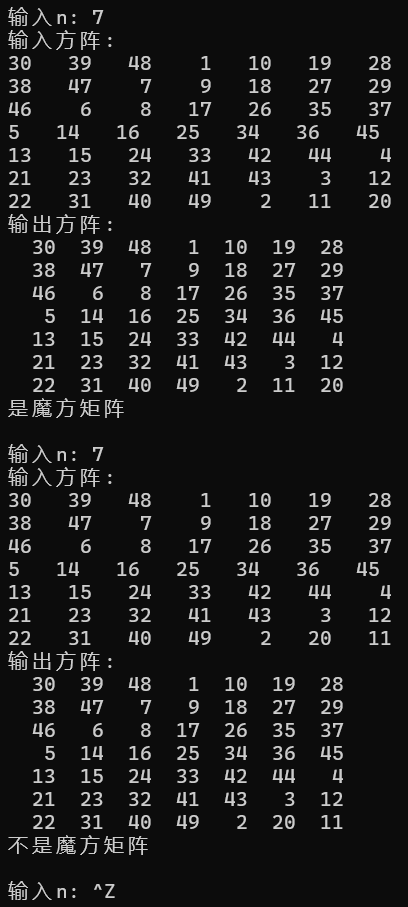 #define _CRT_SECURE_NO_WARNINGS #include <stdio.h> #define N 100 void input(int x[][N], int n); void output(int x[][N], int n); int is_magic(int x[][N], int n); int main() { int x[N][N]; int n; while (printf("输入n: "), scanf("%d", &n) != EOF) { printf("输入方阵:\n"); input(x, n); printf("输出方阵:\n"); output(x, n); if (is_magic(x, n)) printf("是魔方矩阵\n\n"); else printf("不是魔方矩阵\n\n"); } return 0; } void input(int x[][N], int n) { int i, j; for (i = 0; i < n; ++i) { for (j = 0; j < n; ++j) scanf("%d", &x[i][j]); } } void output(int x[][N], int n) { int i, j; for (i = 0; i < n; ++i) { for (j = 0; j < n; ++j) printf("%4d", x[i][j]); printf("\n"); } } int is_magic(int x[][N], int n) { int i, j; int real = 0, test = 0; for (i = 0, j = 0; i < n; i++, j++) { real += x[i][j]; } for (i = 0, j = n - 1; j >= 0; i++, j--) { test += x[i][j]; } if (test != real) return 0; test = 0; for (i = 0; i < n; i++) { for (j = 0; j < n; j++) test += x[i][j]; if (test != real) return 0; test = 0; } for (j = 0; j < n; j++) { for (i = 0; i < n; i++) test += x[i][j]; if (test != real) return 0; test = 0; } return 1; }
