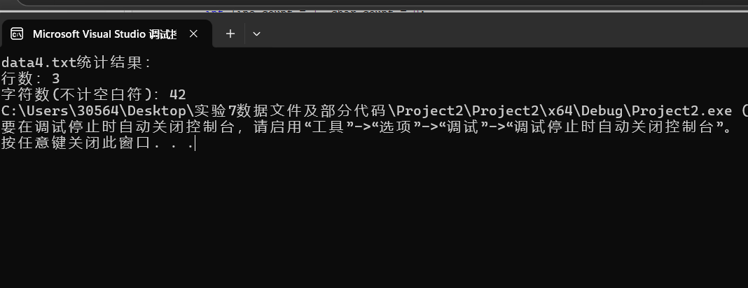 #define _CRT_SECURE_NO_WARNINGS #include <stdio.h> int main() { int line_count = 1, char_count = 0; FILE * fp = fopen("data4.txt", "r"); if (fp == NULL) { printf("fail"); return; } while (!feof(fp)) { char ch = fgetc(fp); if (ch == EOF) break; if (ch == '\n') line_count++; else if (!(ch == '\t' || ch == ' ')) char_count++; } fclose(fp); printf("data4.txt统计结果:\n行数:%d\n字符数(不计空白符):%d", line_count, char_count); return 0; }