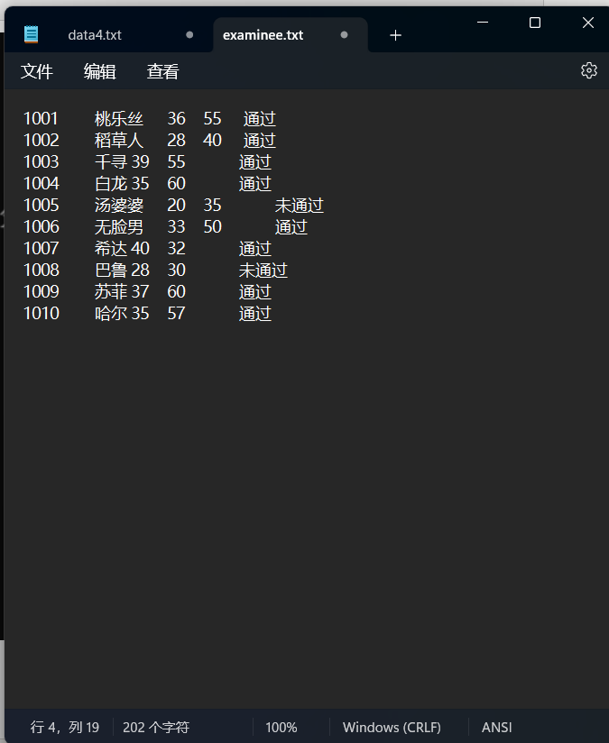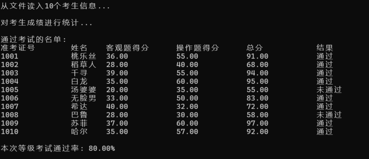 #define _CRT_SECURE_NO_WARNINGS #include <stdio.h> #include <string.h> #define N 10 typedef struct { long id; // 准考证号 char name[20]; // 姓名 float objective; // 客观题得分 float subjective; // 操作题得分 float sum; // 总分 char result[10]; // 考试结果 } STU; // 函数声明 void read(STU st[], int n); void write(STU st[], int n); void output(STU st[], int n); int process(STU st[], int n, STU st_pass[]); int main() { STU stu[N], stu_pass[N]; int cnt; double pass_rate; printf("从文件读入%d个考生信息...\n", N); read(stu, N); printf("\n对考生成绩进行统计...\n"); cnt = process(stu, N, stu_pass); printf("\n通过考试的名单:\n"); output(stu, N); // 输出所有考生完整信息到屏幕 write(stu, N); // 输出考试通过的考生信息到文件 pass_rate = 1.0 * cnt / N; printf("\n本次等级考试通过率: %.2f%%\n", pass_rate*100); return 0; } // 把所有考生完整信息输出到屏幕上 // 准考证号,姓名,客观题得分,操作题得分,总分,结果 void output(STU st[], int n) { int i; printf("准考证号\t姓名\t客观题得分\t操作题得分\t总分\t\t结果\n"); for (i = 0; i < n; i++) printf("%ld\t\t%s\t%.2f\t\t%.2f\t\t%.2f\t\t%s\n", st[i].id, st[i].name, st[i].objective, st[i].subjective, st[i].sum, st[i].result); } // 从文本文件examinee.txt读入考生信息:准考证号,姓名,客观题得分,操作题得分 void read(STU st[], int n) { int i; FILE *fin; fin = fopen("examinee.txt", "r"); if (!fin) { printf("fail to open file\n"); return; } while (!feof(fin)) { for (i = 0; i < n; i++) fscanf(fin, "%ld %s %f %f", &st[i].id, st[i].name, &st[i].objective, &st[i].subjective); } fclose(fin); } // 把通过考试的考生完整信息写入文件list_pass.txt // 准考证号,姓名,客观题得分,操作题得分,总分,结果 void write(STU s[], int n) { FILE* fp; fp = fopen("list_pass.txt", "w"); int i; for (i = 0; i < n; i++) { fprintf(fp,"%ld\t\t%s\t%.2f\t%.2f\t%.2f\t%s\n",s[i].id,s[i].name,s[i].objective,s[i].subjective,s[i].sum,s[i].result) } fclose(fp); } // 对考生信息进行处理:计算每位考生考试总分、结果;统计考试通过的人数 int process(STU st[], int n, STU st_pass[]) { int i,count=0; for (i = 0; i < n; i++) { st[i].sum = st[i].objective + st[i].subjective; if (st[i].sum >= 60) { strcpy(st[i].result, "通过"); st_pass[count++] = st[i]; } else { strcpy(st[i].result, "未通过"); } } return count; }
