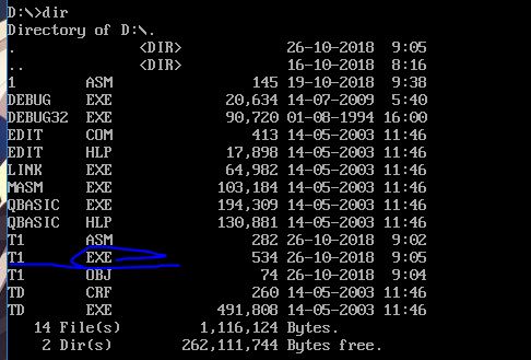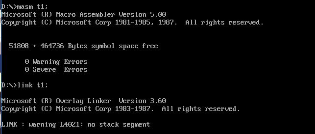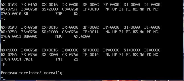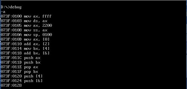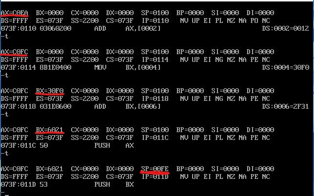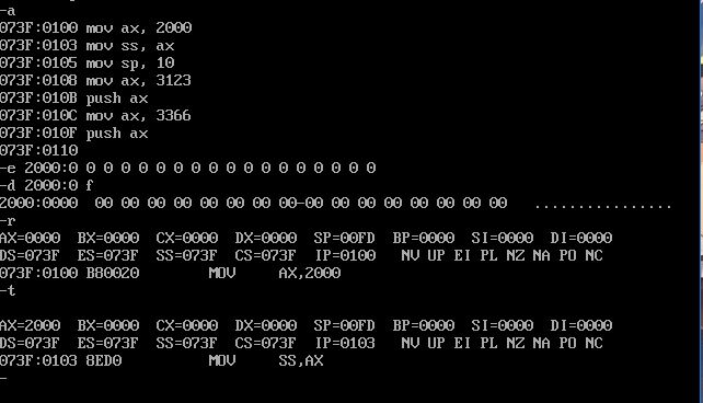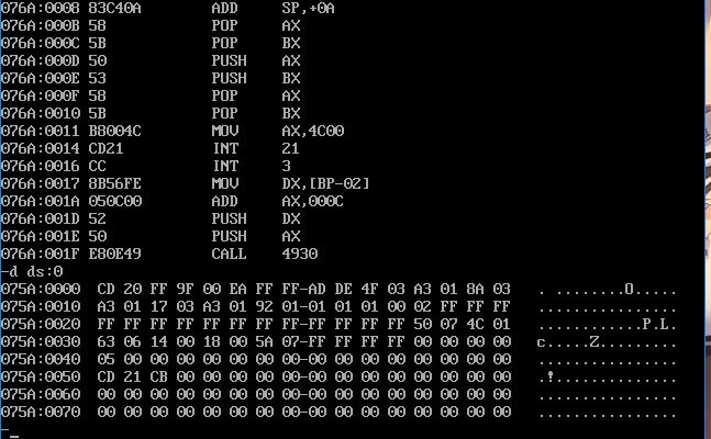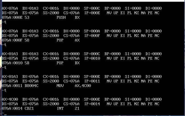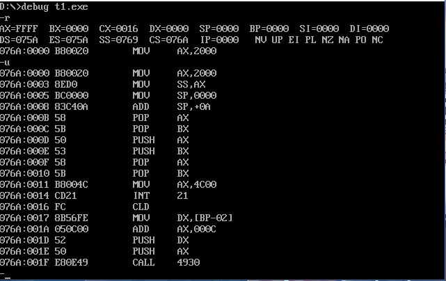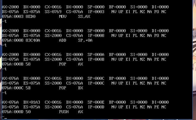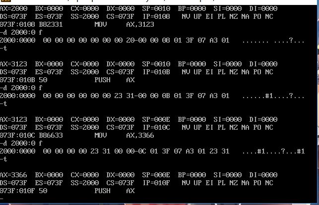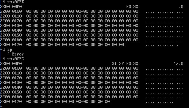 这里明显可以看出经过t命令之后用d命令查看栈所在的ss地址的内容发现被修改,里面有一段内容为cs:ip的值,