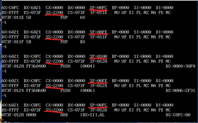 这里可以看到ss是2200且sp开始为0100因为开始修改了它们的值,故修改的内存地址都是SS:SP,另外栈