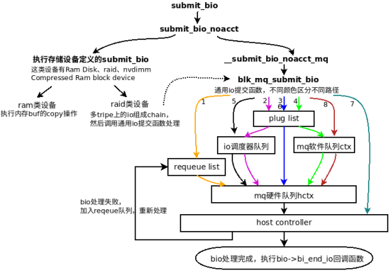 blk_mq_submit_bio将bio提交给存储设备处理,bio经不同路径被提交至不同的链表,最终由器件的host controller处理。bio的处理路径见图1,后继文章(待整理)会对代码细节展开描述。图1遵循以下原则: