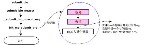 提交bio过程中,视情况,需要对bio拆分、合并(拆分后得到的bio不允许合并),逻辑图见图2。