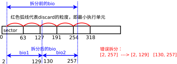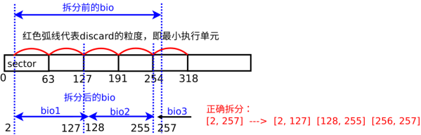 正确的做法是:拆分一个bio时,将discard_alignment、discard_granularity限制条件考虑进去,拆分后形成的第1个bio起始sector可以不满足限制条件,但能确保后继bio的起始sector满足条件,这样就可以让拆分后形成的bio最多只可能有2个bio不能执行discard(第1个bio的起始sector不满足限制条件、最后一个bio的结束sector不满足限制条件)。对[2,257]范围内的sector执行discard,将会拆分成[2,127]、[128,255]、[256,257]这3个bio,[63,255]这些sector被执行discard(不会出现连续的、对齐的、满足粒度要求的[128,191]共64个sector没有执行discard的情况)。