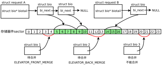 ELEVATOR_FRONT_MERGE:如果待合并的bio的结束sector号=rq中bio起始sector号,则将bio合并到已有bio的前面。