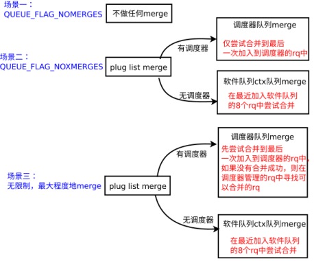 路径6:io发起者执行了blk_start_plug(发起者预计接下来有多个io请求时,会执行此函数),且存储设备设置了QUEUE_FLAG_NOMERGES(不允许合并io请求)、且没有io调度器,执行此路径流。这个场景下,仅做有限的合并,若bio与plug list中的rq可以合并则合并,否则就添加到plug中。plug list存在属于相同存储设备的rq,尝试将bio合并到plug list的rq,接着执行blk_mq_try_issue_directly将plug list中的rq发送到下层队列中,这体现了“有限合并”的含义,且只做一次合并,另外也意味着,任何时候,在plug list中只属于一个存储设备的rq有且只有一个。
