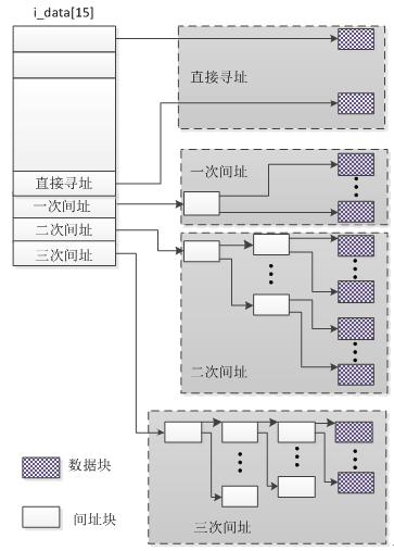 文件偏移量file->f_pos转换成page index后,乘以blocks per page,得到逻辑块号。inode->i_data[15]前12个元素存放的是数据物理块号,i_data[12]存放的是一个间址块号,这个间址块按4字节划分成,每个小块中存放的物理数据物理块号,由于用到了一个间址块,所以称为一级间址。i_data[13]是二级间址,i_data[14]是三级间址。