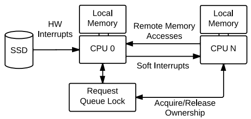 - 如果提交io请求的cpu不是接收到硬件中断的cpu,还存在远端内存访问的问题。