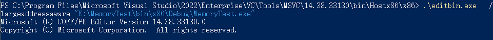 .\editbin.exe /largeaddressaware "E:\MemoryTest\bin\x86\Debug\MemoryTest.exe"