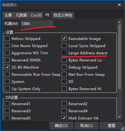 可以看到,默认是i386 机器,默认的 Larg Address Aware 是没有被选中的。