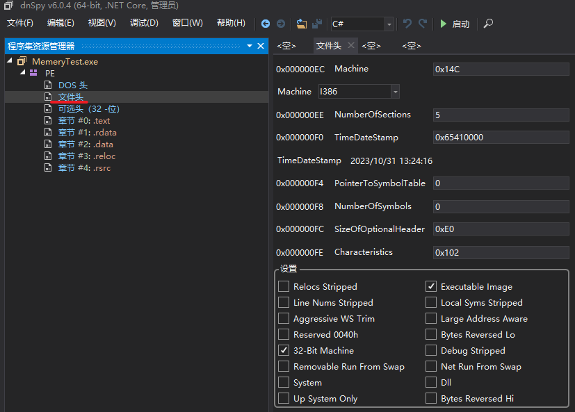 打开这个软件,把我们验证的MemeryTest (32) 应用程序直接拖拉进去,就会显示我们的程序集相关信息,在我的步骤第二步,编辑模块,就可以看到这个应用程序的PE头里的信息。