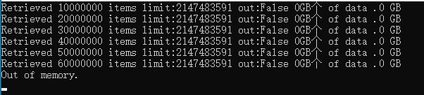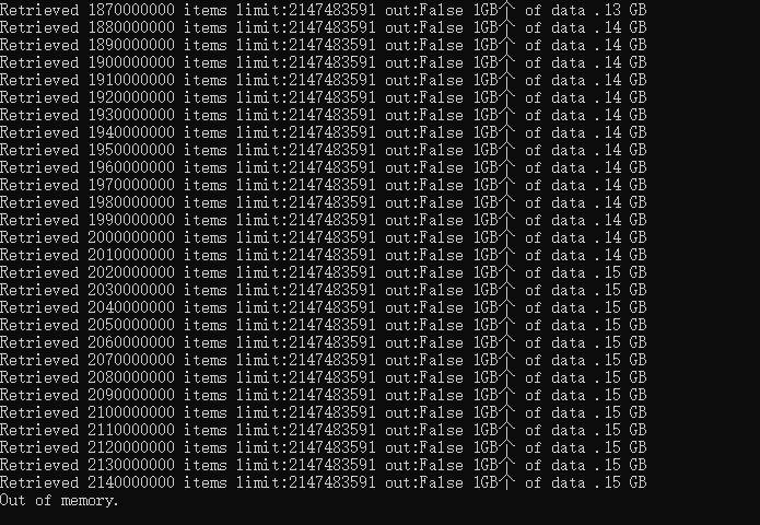 Retrieved 280000000 items limit:2147483591 out:False 0GB个 of data .2 GB