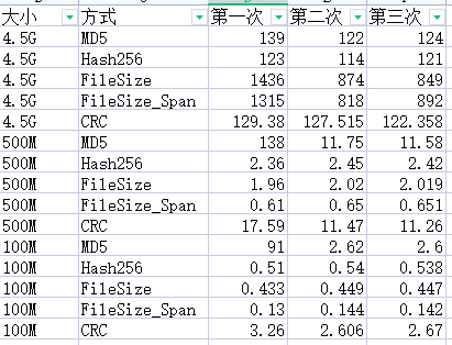 文件小于1G ?,FileSize_Span方式会更优,除了MD5,其他方式基本都差不多,CRC属于不上也不下。