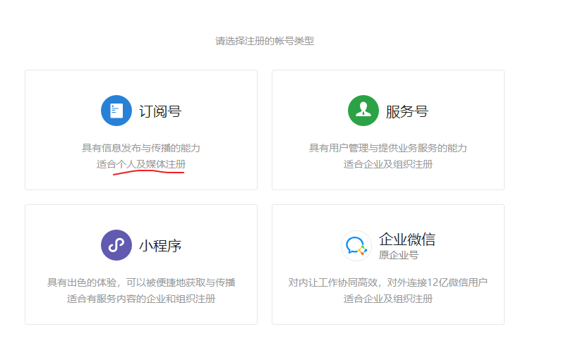 可以看到,订阅号是适合个人注册的,一天能发一条(一条包含好几篇文章)这种。