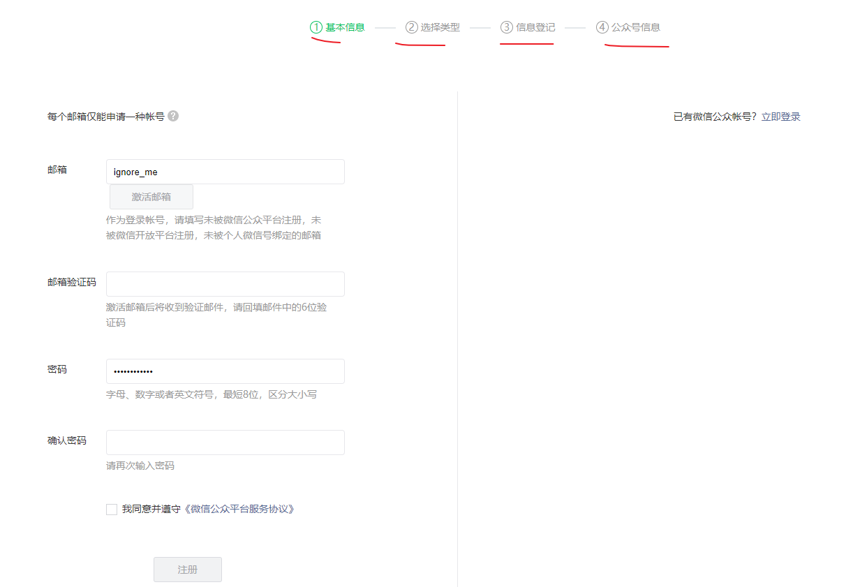 登录公众号官网(https://mp.weixin.qq.com/),点击立即注册