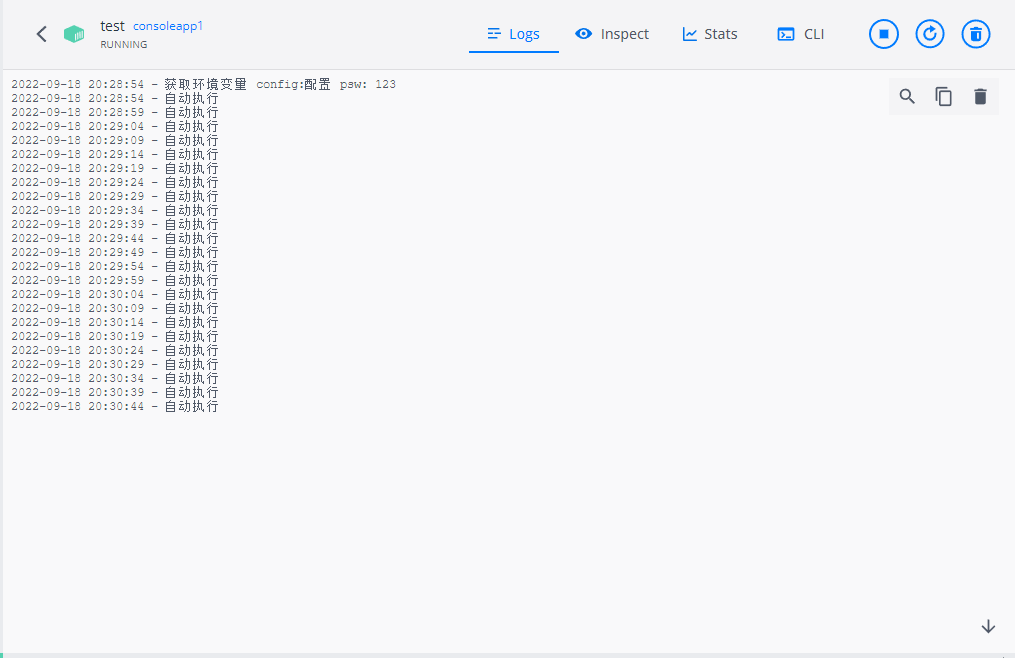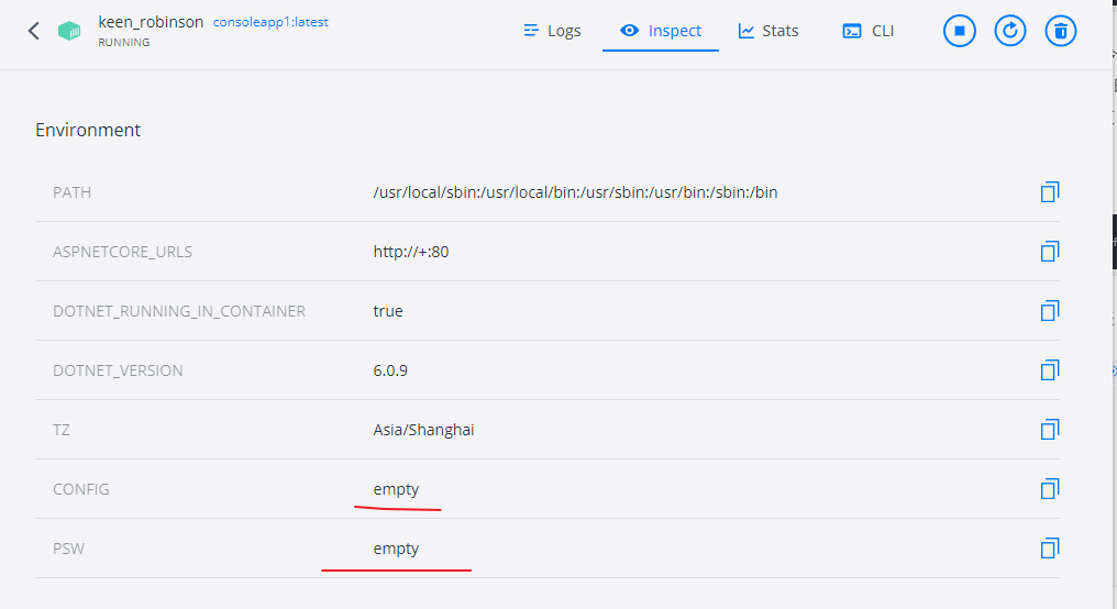 docker run --name test -e psw=123 -e config=配置 -it -d consoleapp1