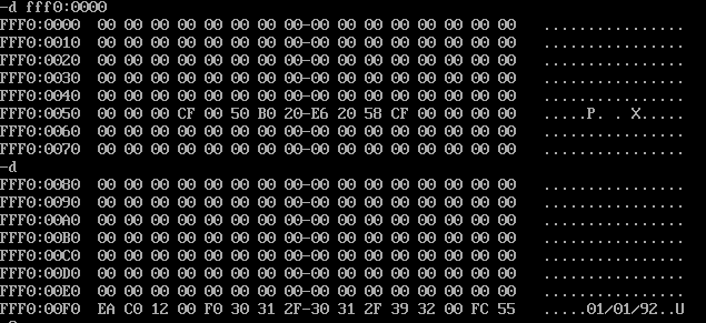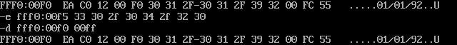 (2)给出使用e命令修改生产日期所在内存单元的截图,以及,修改后,再次使用d命令查看的截图