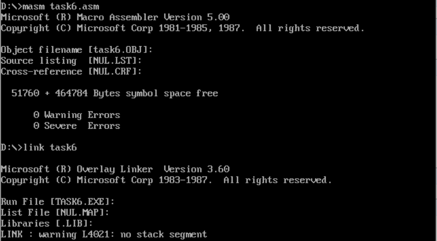(2)给出使用masm、link对程序汇编链接过程截图,以及,运行可执行程序task5.exe的运行结果截图