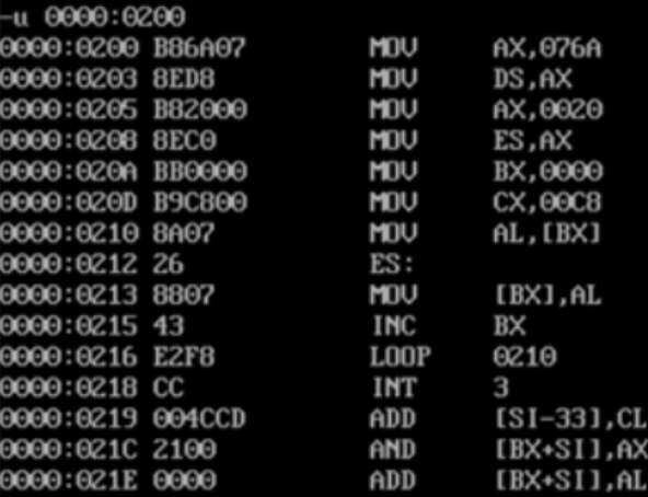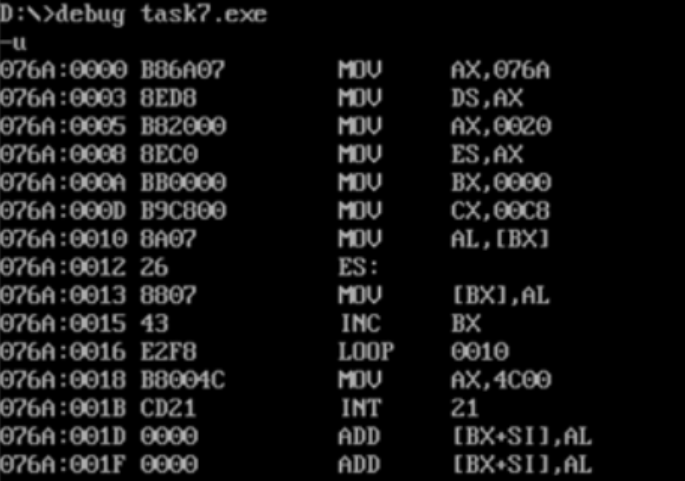 (2)在debug中调试,使用g命令将程序执行到Loop s之后,mov ax,4c00h之前,然后,使用u命令对0:200开始的内存单元反汇编,确认是否把task7,asm中的line3-line12的代码复制到了目标内存空间;给出使用g命令运行到指定点和使用u命令反汇编0:200到复制代码长度这一段内存空间的截图。