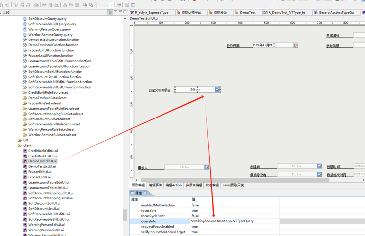 3、打开XXXEditUI.ui,修改F7字段的queryInfo,原来是指向物料的query,改成自定义核算项目的query