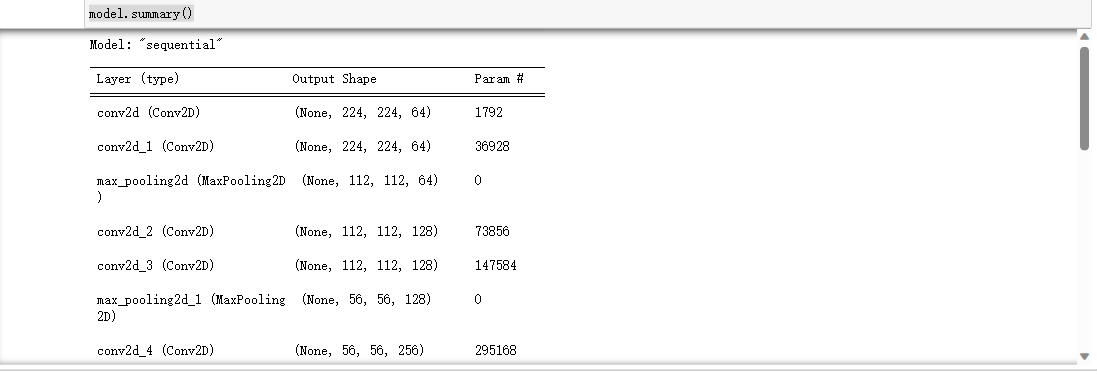 1 #创建一个空的顺序模型 2 model = Sequential() 3 #向该模型增加64个大小为3*3过滤器的形状为224x224x3的图像的卷积层,设置激活函数为ReLU,并使用same填充方式保持输出特征图大小不变 4 model.add(Conv2D(input_shape=(224,224,3),filters=64,kernel_size=(3,3),padding="same", activation="relu")) 5 #向该模型增加64个大小为*3的过滤器的卷积层,设置激活函数为ReLU,并使用same填充方式保持输出特征图大小不变。"再次添加了一个同样大小的卷积层进行特征提取" 6 model.add(Conv2D(filters=64,kernel_size=(3,3),padding="same", activation="relu")) 7 #使用2x2大小的窗口进行2倍下采样,减小特征图的空间大小 8 model.add(MaxPool2D(pool_size=(2,2),strides=(2,2))) 9 #向该模型增加128个大小为3*3的过滤器的卷积层,设置激活函数为ReLU,并使用same填充方式保持输出特征图大小不变 10 model.add(Conv2D(filters=128, kernel_size=(3,3), padding="same", activation="relu")) 11 model.add(Conv2D(filters=128, kernel_size=(3,3), padding="same", activation="relu")) 12 model.add(MaxPool2D(pool_size=(2,2),strides=(2,2))) 13 #向该模型增加256个大小为3*3的过滤器的卷积层,设置激活函数为ReLU,并使用same填充方式保持输出特征图大小不变 14 model.add(Conv2D(filters=256, kernel_size=(3,3), padding="same", activation="relu")) 15 model.add(Conv2D(filters=256, kernel_size=(3,3), padding="same", activation="relu")) 16 model.add(Conv2D(filters=256, kernel_size=(3,3), padding="same", activation="relu")) 17 model.add(MaxPool2D(pool_size=(2,2),strides=(2,2))) 18 #向该模型增加512个大小为3*3的过滤器的卷积层,设置激活函数为ReLU,并使用same填充方式保持输出特征图大小不变 19 model.add(Conv2D(filters=512, kernel_size=(3,3), padding="same", activation="relu")) 20 model.add(Conv2D(filters=512, kernel_size=(3,3), padding="same", activation="relu")) 21 model.add(Conv2D(filters=512, kernel_size=(3,3), padding="same", activation="relu")) 22 model.add(MaxPool2D(pool_size=(2,2),strides=(2,2))) 23 #向该模型增加512个大小为3*3的过滤器的卷积层,设置激活函数为ReLU,并使用same填充方式保持输出特征图大小不变 24 model.add(Conv2D(filters=512, kernel_size=(3,3), padding="same", activation="relu")) 25 model.add(Conv2D(filters=512, kernel_size=(3,3), padding="same", activation="relu")) 26 model.add(Conv2D(filters=512, kernel_size=(3,3), padding="same", activation="relu")) 27 model.add(MaxPool2D(pool_size=(2,2),strides=(2,2))) 28 29 #使用 Flatten() 函数将之前的卷积层的输出压平成一维向量 30 model.add(Flatten()) 31 #添加一个具有4096个神经元和ReLU激活函数的全连接层 32 model.add(Dense(units=4096,activation="relu")) 33 #再次添加一个具有4096个神经元和ReLU激活函数的全连接层 34 model.add(Dense(units=4096,activation="relu")) 35 #添加一个具有525个神经元(代表ImageNet的分类数) 和softmax激活函数的输出层,用于对输入图像进行分类 36 model.add(Dense(units=525, activation="softmax"))