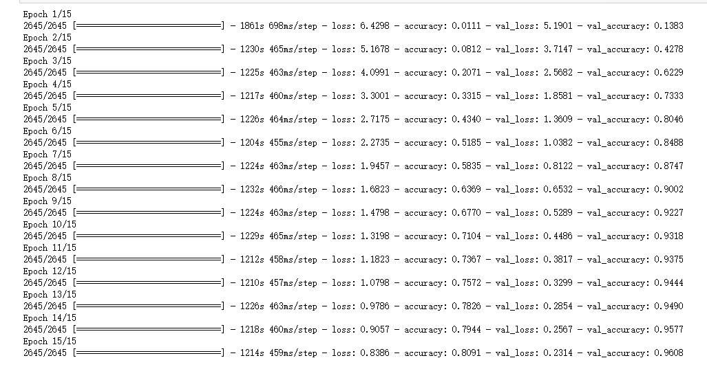 1 history =model.fit(train_generator, 2 validation_data=test_generator, 3 epochs=15) 4 #train_generator和test_generator分别表示训练集和测试集的数据生成器对象 5 #epochs指定训练数据的迭代次数为15次,并包含了每次迭代的损失值和精度值