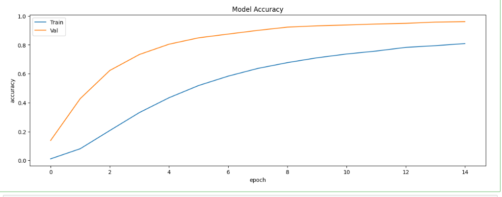 1 #绘制精度曲线图 2 plt.figure(figsize=(12,5)) 3 plt.plot(history.history['accuracy'])#使用plot函数绘制训练集上的精度曲线 4 plt.plot(history.history['val_accuracy'])#使用plot函数绘制验证集上的精度曲线 5 plt.title('Model Accuracy') 6 plt.ylabel('Accuracy') 7 plt.xlabel('Epochs') 8 plt.legend(['Train','Val'], loc = 'upper left') 9 plt.show()