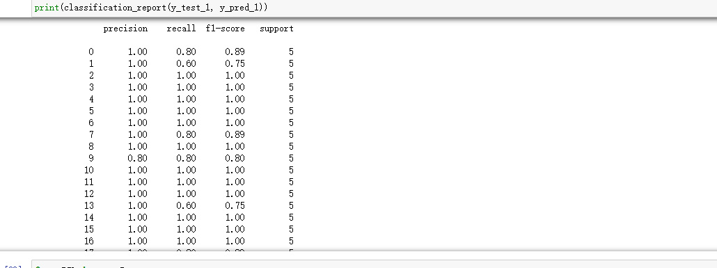 1 #鸟类分类报告 2 from sklearn.metrics import classification_report 3 4 print(classification_report(y_test_1, y_pred_1)) 5 #调用classification_report函数,将真实标签y_test_1和预测标签y_pred_1作为参数传入,生成分类报告并输出
