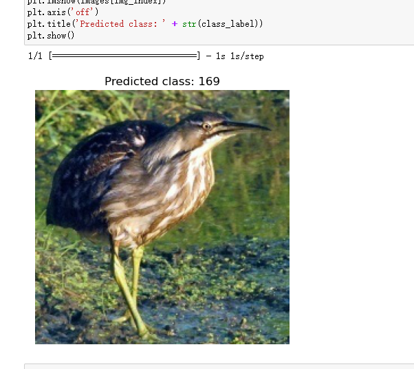 1 #指定文件夹中的图片进行预测 2 from PIL import Image 3 import os 4 import numpy as np 5 import matplotlib.pyplot as plt 6 7 image_directory = './lty/bird-species/valid/AMERICAN BITTERN' 8 img_size = 224#设置输入模型的图像大小 9 10 images = [] 11 for filename in os.listdir(image_directory): 12 path = os.path.join(image_directory, filename) 13 img = Image.open(path)#打开图片文件,并返回一个Image对象 14 img = img.resize((img_size, img_size)) 15 images.append(img)#将处理后的图片对象添加到列表中 16 17 18 images = np.array([np.array(img) for img in images]) 19 images = images / 255.0 #对图像数据进行归一化 20 21 predictions = model.predict(images) 22 #使用已经训练好的模型对输入的图像进行预测,并返回预测结果 23 24 img_index = 0 25 26 27 class_label = np.argmax(predictions[img_index]) 28 #获取指定图片的预测标签 29 30 plt.imshow(images[img_index]) 31 plt.axis('off') 32 plt.title('Predicted class: ' + str(class_label))#设置标题,用于显示预测结果中的类别标签 33 plt.show()