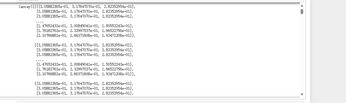 1 #train_generator生成器的方式,获取batch的数据 2 #返回图像数据和标签数据 3 img= train_generator[0] 4 print(img)