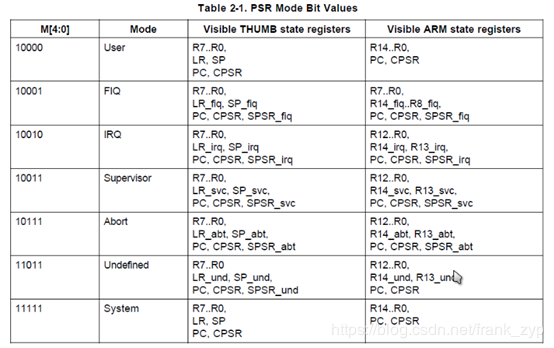 8、未定义指令中止模式(Undefined):当未定义的指令执行时进入该模式,可用于支持硬件协处理器的软件仿真。