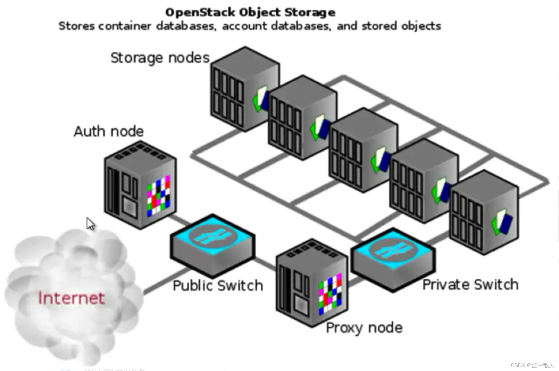 - 代理服务(Proxy Server):对外提供对象服务 API,转发请求至相应的账户、容器或对象服务