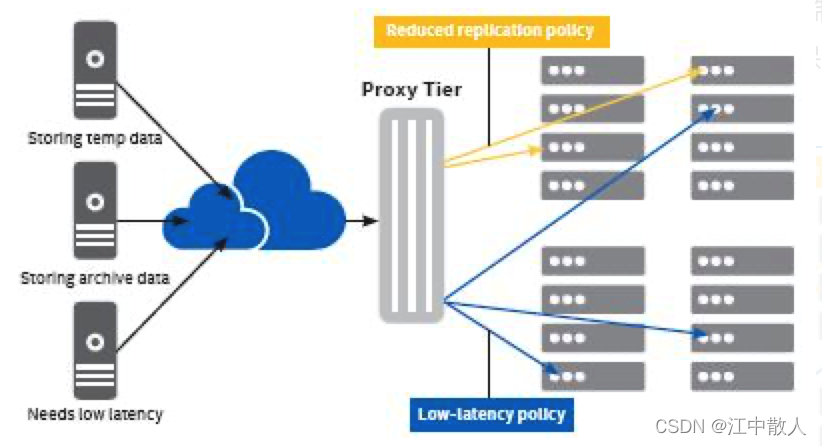 通过应用该新的功能,Swift 用户可以制定不同的存储策略,来适应不同应用的存储需求。比如对关键应用的数据,制定一个存储策略使得数据被保存到 SSD 上;对于一般关键性的数据,指定存储策略使得数据只保存2份来节约磁盘空间。比如说: