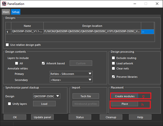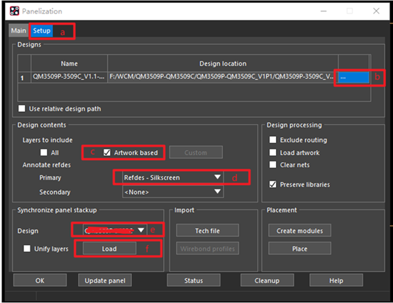 (步骤b为导入要拼版的pcb文件,步骤e选择要拼版的PCB文件,新的PCB没有叠层设置,步骤f为同步叠层设置)