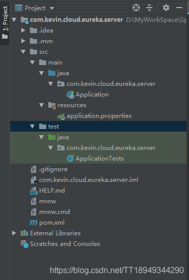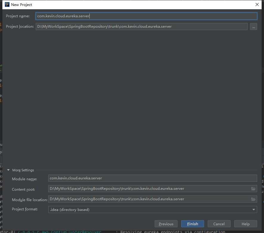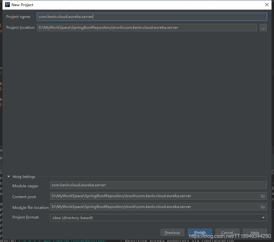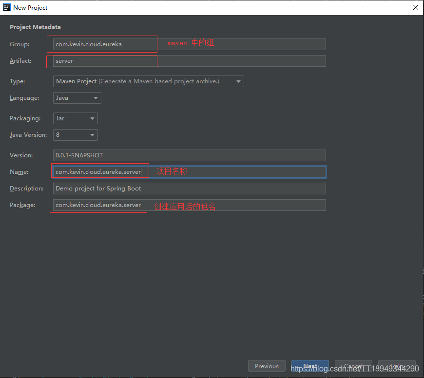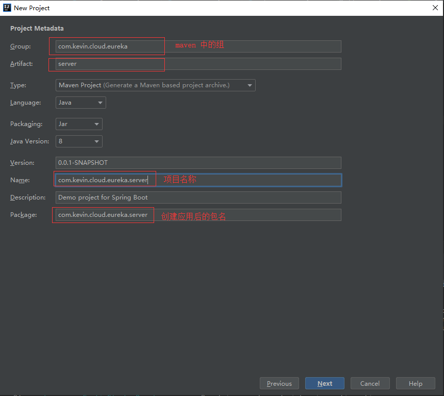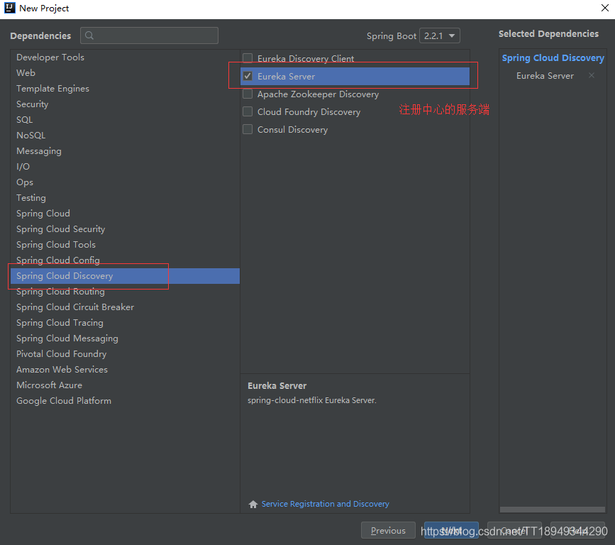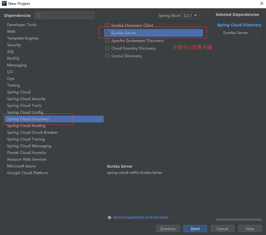 请注意,上面这里选择的是Eureka server ,选择后创建完项目就会自动在pom.xml文件中增加都eureka的依赖,如果这里不选择,也可以项目创建好以后手动添加,这里一步勾选,省去后面的麻烦。