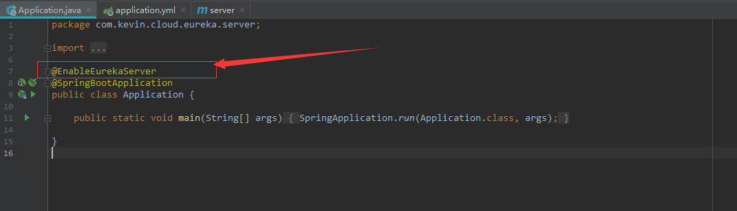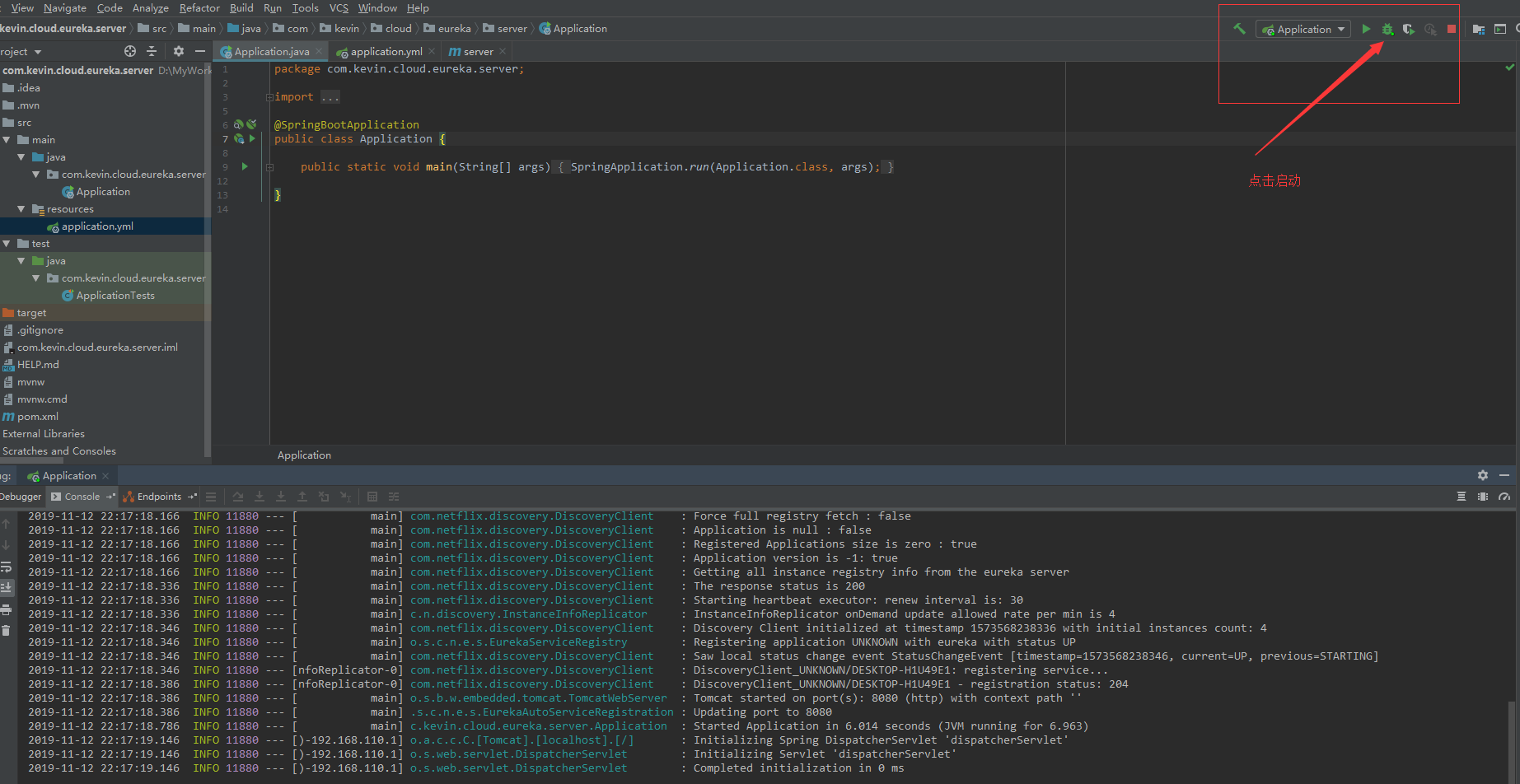 在打开Application.java,添加注解@EnableEurekaServer,申明这是一个Eureka的server 启动类,然后重启项目。