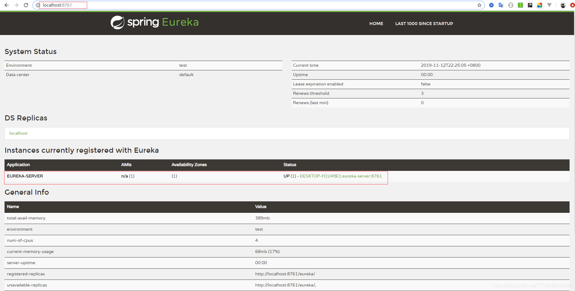 打开localhost:8761,Eureka 的注册中心查看页面出来了,并且看到下面有一个客户端已经注册进来,仔细一看,端口号8761,这不是server 自己吗?