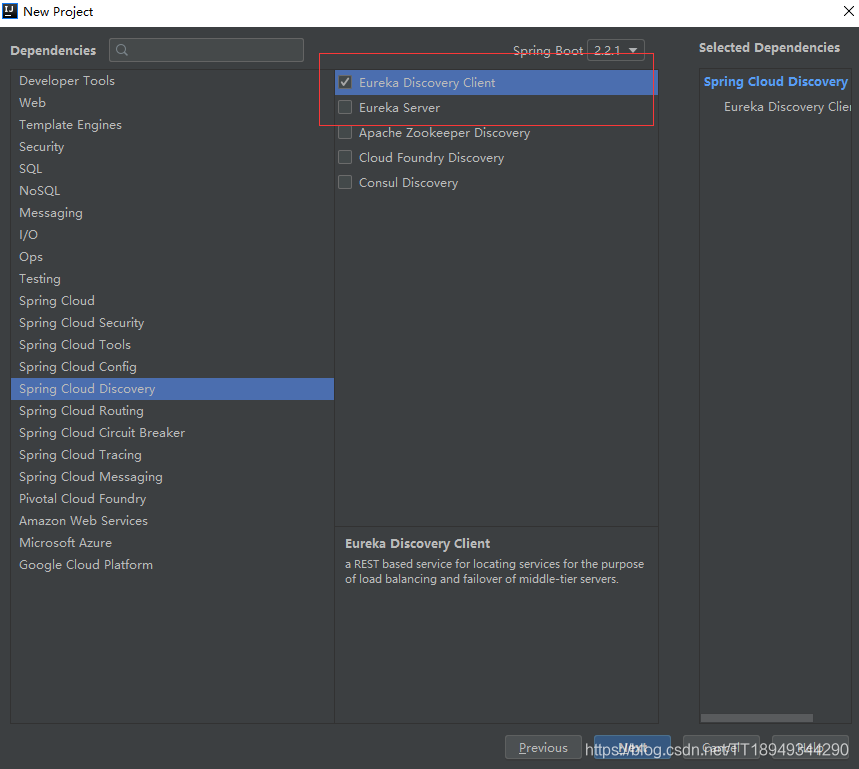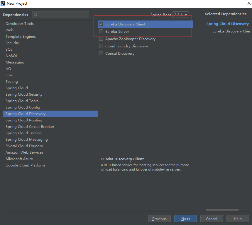 客户端项目创建Server创建一样,但是在创建的第三步时需要选择Eureka Discovery Client,表示这是创建的客户端项目