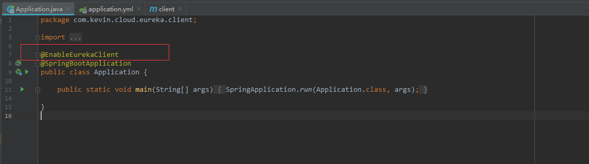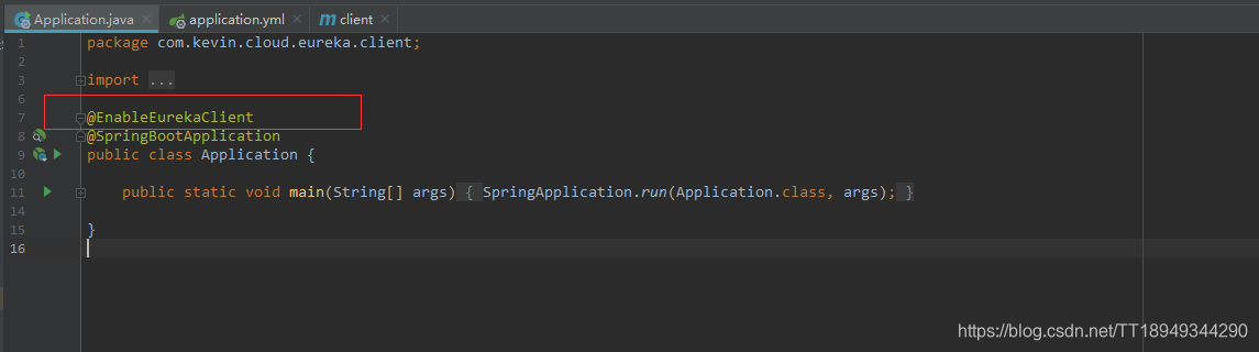 找到Application.java 文件入口,添加@EnableEurekaClient注解,代表这是一个Eureka客户端