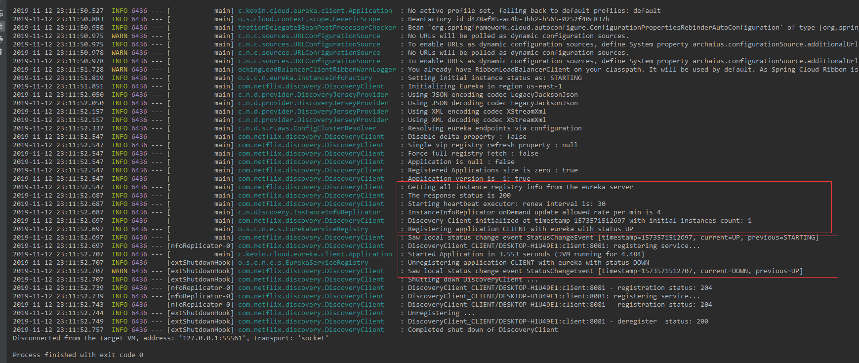 Server 启动成功,Client启动后没报错,但是会立马停止。这是因为我们在新建项目的时候,并没有说明client是一个web项目,而是一个普通的java应用程序,因此会在启动后立马停止。于是,在Client项目的pom文件中添加web依赖,再次重启Client项目。